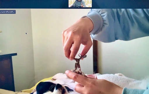 いつもの環境で飼い主様と愛犬が「ケアが出来る・受けられる」ようになることが目的の為、オンライン&オフライン(ご自宅にお伺いしてのレッスン)を組み合わせての受講です。